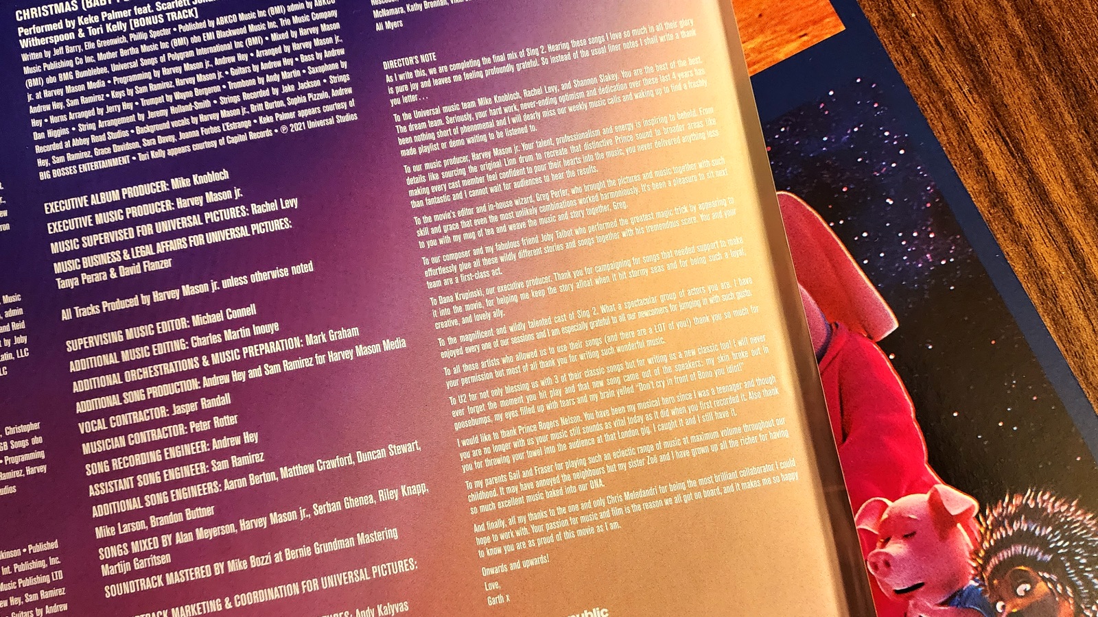 And at the end of the insert is a letter from the director, Garth Jennings, with a message of thanks to the people who made the movie possible. It’s almost like a speech someone would give at an award ceremony. It’s a nice heartfelt message that offers more insight into how the music made the movie.